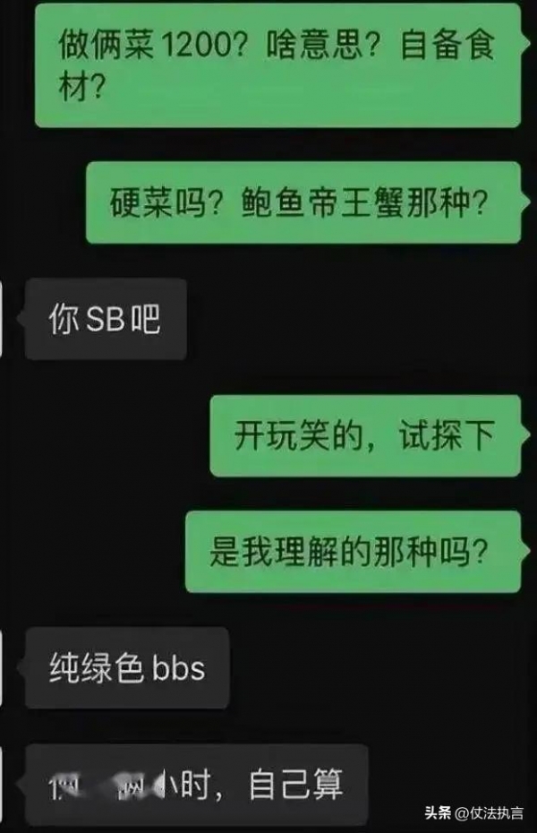 经过各种旁敲侧击,小李终于明白了这种所谓的高价上门做菜,其实就是一种新型的卖淫方式。