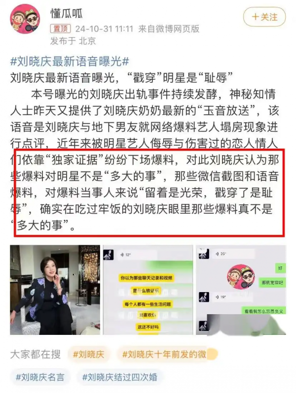 在第二波的爆料中,刘晓庆直言不讳地表示隐私被曝光是对方的耻辱,认为小男友和自己在一起应该感到无比自豪。