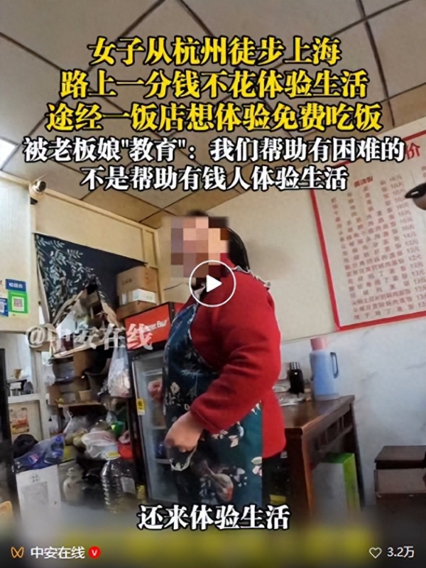 她途经一饭店想体验免费吃饭,被老板娘"教育",老板娘称:"你们这些有钱人,还来体验生活,一顿饭钱都舍不得给。"