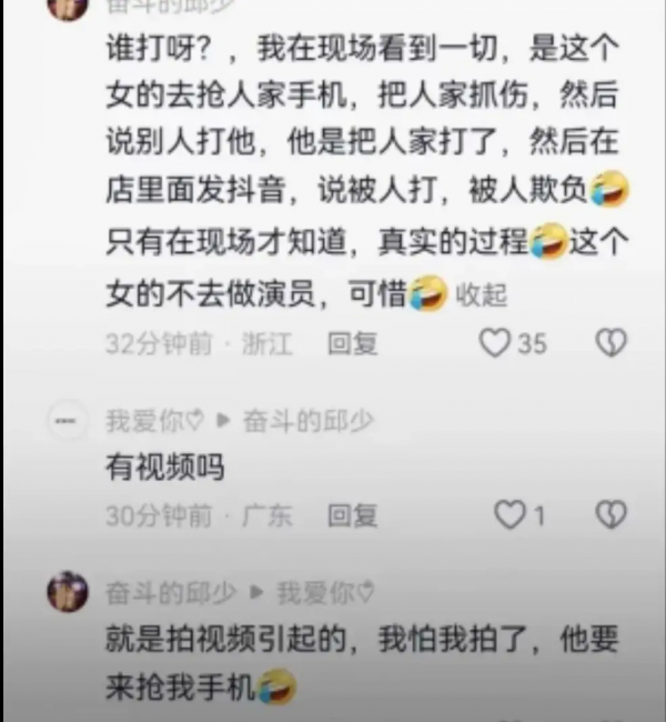 现在觉得可能报警都是她自己报的,当时也是她去抢别人手机然后抓伤别人,最后说别人打她,然后自己在店里面发视频说自己被别人打了。