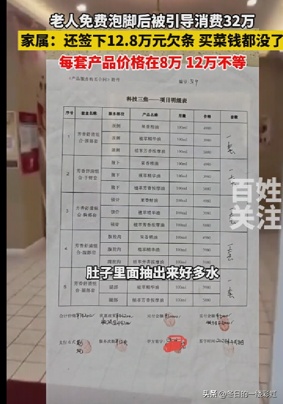 经男子询问得知:母亲最初是接受了足疗店的免费足浴泡脚,被店员推销办理了一张2400元50次的卡。之后,每次去足疗,店员便推荐一些按摩项目和产品,说可以治疗老年病,有几千元到几万元不等。母亲便越来越相信,便开始购买了多个产品,约32万元的费用。包括:推拿、热蒸和针灸等。直到把所有积蓄都花光了,得找儿子借钱了,这才被儿子发现。