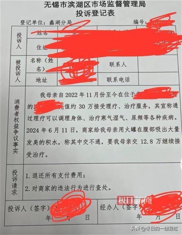 2024年6月,商家用火罐在给老人腹部吸出积水后,让其交12.8万元继续治疗。母亲因此找无锡男子借钱。经询问,无锡男子才发现,母亲已被引导消费近40万元。这样,无锡男子才发现了问题的严重性。