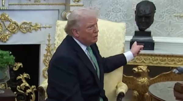 特朗普指向丘吉尔雕像。视频截图
