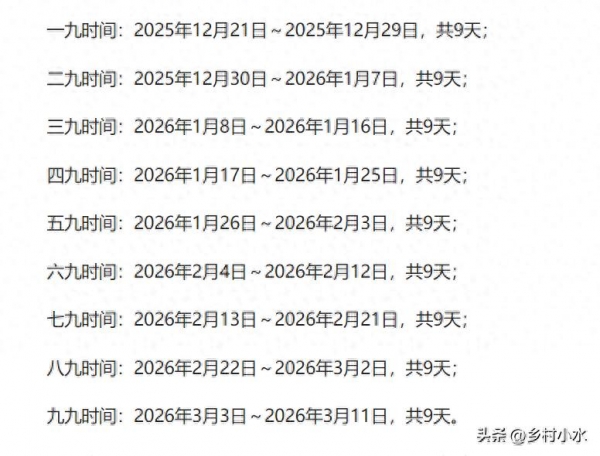 《荆楚岁时记》记载:"俗用冬至日数及九九八十一日,为寒尽",在我国民间有着冬至数九计算寒天的习俗,即从冬至当日算起,每九天为一个"九",共数九九八十一天,那么就意味着寒去暖来,春已深矣,是到了春耕的时候了。