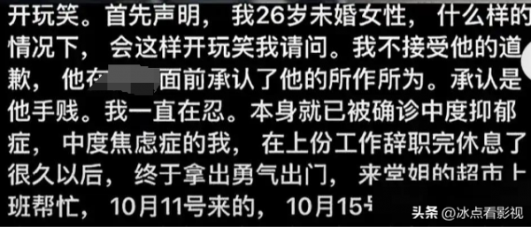 近日,一名26岁的女子在社交媒体上发布了一段视频,视频中她直言不讳地曝光自己的堂姐夫对她进行骚扰,甚至在工作场合中故意表现出不当的身体接触。这样的曝光一经发布,便引发了网友们的热烈讨论,究竟是怎么回事?让我们一起往下看。