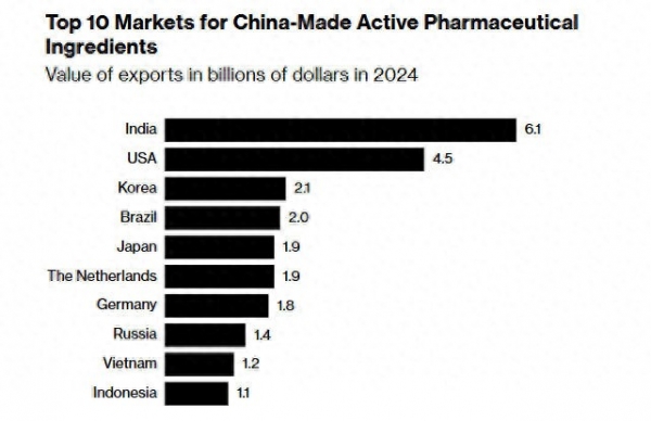 中国制造原料药的十大市场,美国仅次于印度,位居第二 彭博社制图