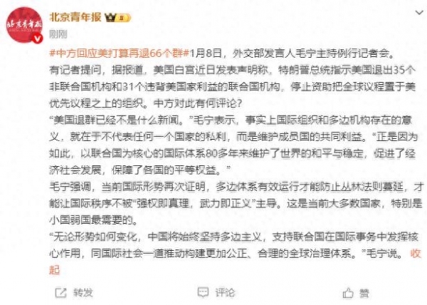 "无论形势如何变化,中国将始终坚持多边主义,支持联合国在国际事务中发挥核心作用,同国际社会一道推动构建更加公正、合理的全球治理体系。"毛宁说。
