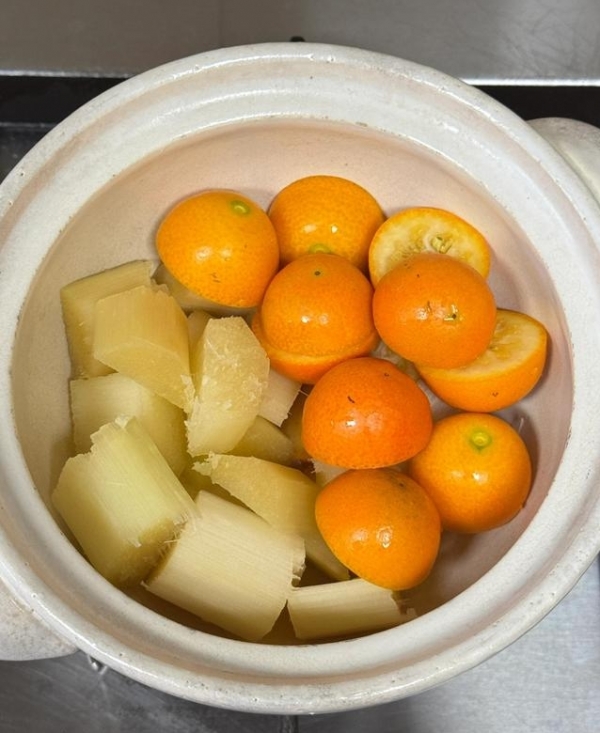 甘蔗配金桔更是绝配。两节青皮甘蔗削皮切块,十个金桔用盐搓净外皮,对半切开。一同下锅煮沸,转小火炖上十五分钟。甘蔗的天然甜味渗进汤里,金桔的清香扑鼻而来,喝一口从头暖到脚。
