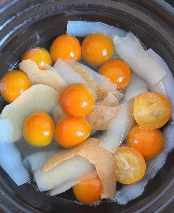 金桔、萝卜皮、梨皮的组合也别有讲究。八个金桔对半切开,半个萝卜的皮、一整个雪梨的皮一同入锅,小火慢炖四十分钟。金桔的微酸混着果皮的清香,喝起来酸甜适口,连呼吸都带着清新的果味。