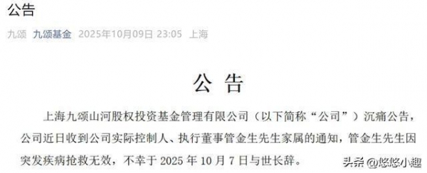 10月9日深夜,上海九颂山河股权投资基金管理有限公司发布讣告。