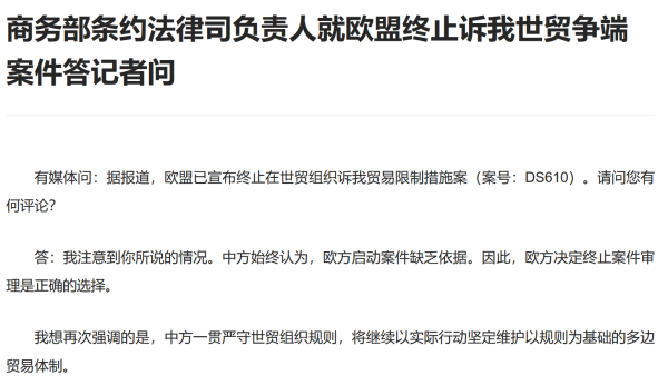 商务部网站4日消息,商务部条约法律司负责人就欧盟终止诉我世贸争端案件答记者问。
