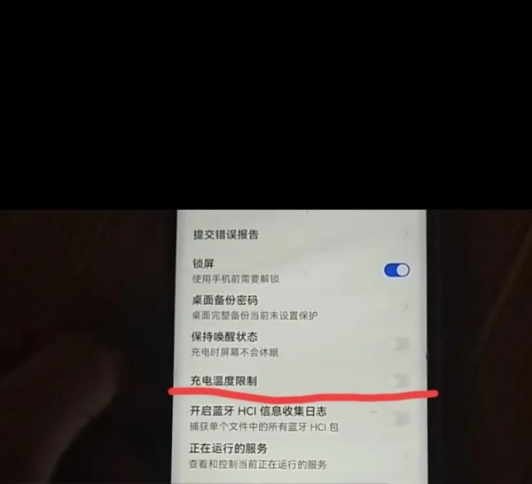 在这里我们可以看到充电温度限制我们将后面的按钮开启,这样在充电时会限制充电温度,就不会出现发热发烫问题了,还会保护我们的手机电池