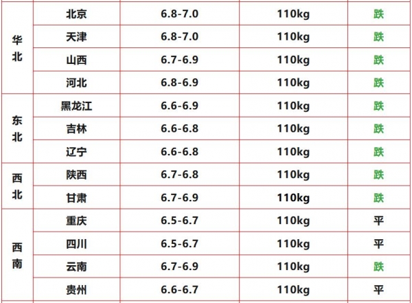 华北地区:河北下跌0.1元/斤,标猪出栏参考价6.8~6.9元/斤。