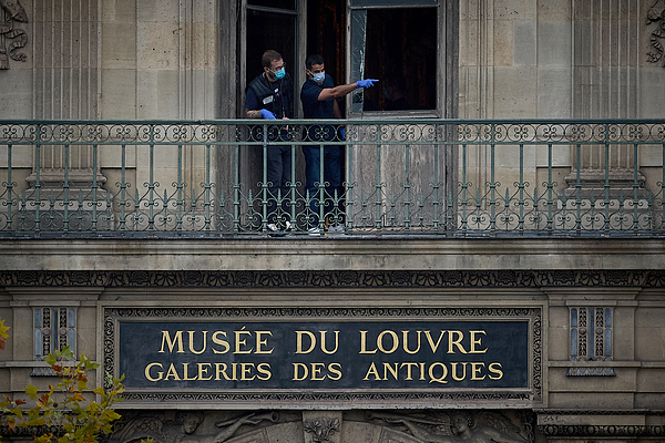 法国犯罪现场调查人员在卢浮宫内一画廊被切割的窗户和阳台处进行检查。 视觉中国