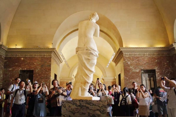游客参观卢浮宫三宝之一的大理石雕塑《米洛斯的维纳斯》(又称《断臂维纳斯》) 观察者网