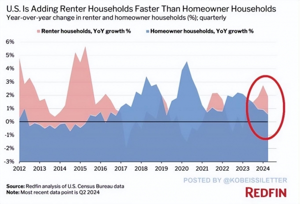 截止到2024年二季度,美国的租房家庭数量创历史新高,为2021年以来的第二大增幅。