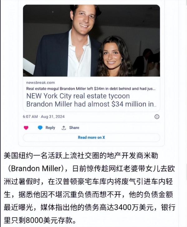 根据纽约时报的最新消息,纽约房地产大亨布兰登·米勒 ,因为财务问题在自家汉普顿庄园的车库里,选择了自杀。