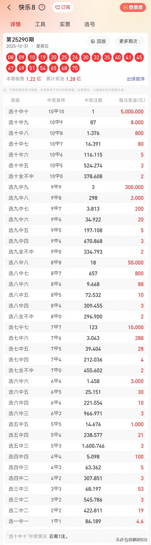 彩票圈又传喜讯!2025年10月31日快乐8第25290期开奖结果重磅出炉,本期不仅诞生了500万元头奖,各奖级中奖数据也颇具看点。下面为您全方位拆解本期开奖的精彩细节。