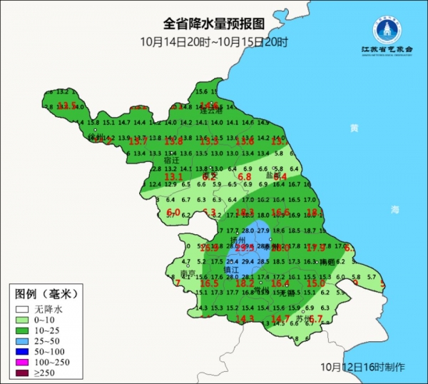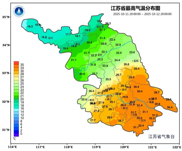 目前的气温情况,苏南和苏北有着十分明显的差异,江苏最北端的徐州等地,最高气温只有16℃出头,而苏州无锡依然在三十几度的闷热里挣扎。
