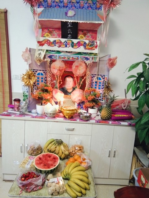 桌上供着用彩纸扎成的天公宝座,还有香炉、烛台。香炉前面摆上三到五个伍寿,这是一种红色的糖制食品,造型像玲珑塔、龙塔或者瑞狮瑞兽啥的。旁边还会放着红鸡蛋、面线、寿桃包,还有至少三杯清茶、三杯白酒或者黄酒。酒和 "九" 对应,向天公敬茶敬酒,表达人们深深的敬意呢。