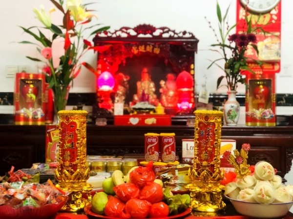 桌上的鲜花最好是用盘供奉的散花,五颜六色的都行,可千万别用白花哦。水果要摆三或五种,像橙子、香蕉、苹果、菠萝、柑橘这些有好寓意的水果都是常见的选择。这里面,一对上有叶子、下有根须的甘蔗可不能少,它代表有头有尾,祭拜的时候还会在甘蔗上挂一对长线,象征新一年生活甜如蜜、节节高。