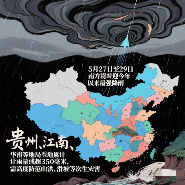 今日(5月26日),中央气象台发布预警,**5月27日至29日南方将迎今年以来最强降雨**,贵州、江南、华南等地局地累计雨量或超350毫米,需高度防范山洪、滑坡等次生灾害。