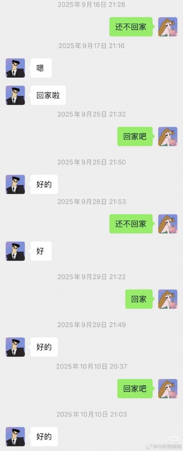 几乎每天,李女士都会催他回家。2025年7月25日23时,李女士问他:"还没回来吗",次日1:25,他说:"那我现在开车回去"。同年10月15日22时,李女士说:"该回家了,不然得凌晨回来了",次日2:16,他说:"马上到家,飞奔而来"。