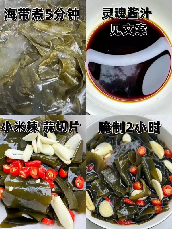 1. 干海带泡发(冷水泡1小时至变软),洗净切丝;
