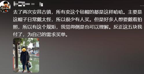 对此,安昌古镇工作人员回复说:他们已经关注到此事,古镇有几家商户在卖乌毡帽,由于该商户考虑到大多游客只是试戴拍照而非购买,所以制定了"试戴拍照 5 元"的创收模式,但这种方式未提前明确告知、也未充分尊重游客体验,事情发生后,景区工作人员找到商户,要求商户明确码标价。