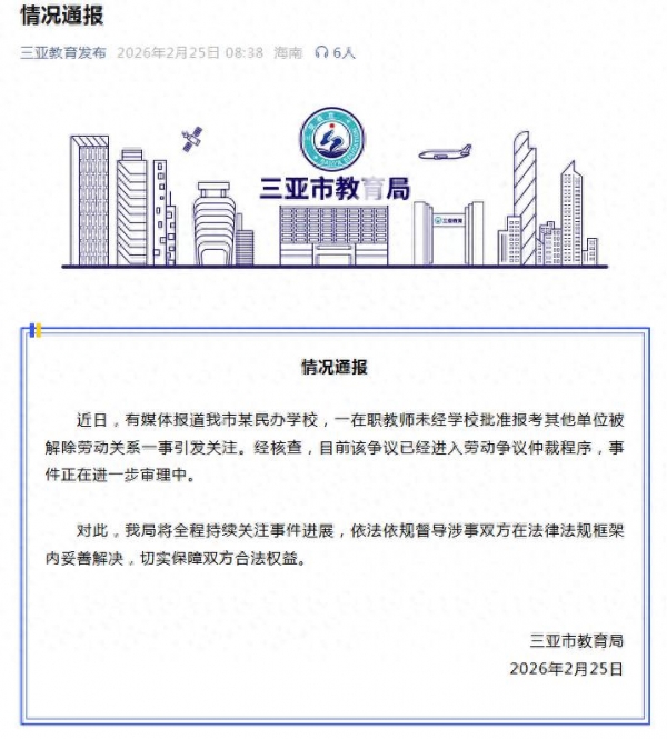 此前据现代快报报道,三亚中学于2025年决定开除一名在校老师,因为其"在2025年9月至10月期间,未经学校批准报名了其他单位的招聘并参加考试"。校方认为,该老师的行为违反学校《教职工管理规定》,属于严重违纪行为,决定予以开除处分。