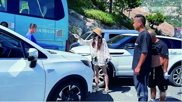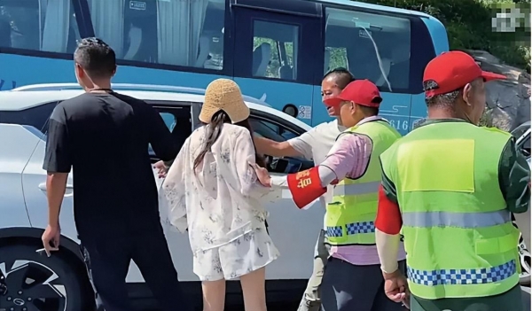她回车上之后,交通疏导人员过来劝阻,问她为什么要逆行。她与工作人员争吵,推搡对方,又在倒车时与前方的旅游大巴车发生剐蹭,接下来的事情被旁边一位游客拍到,就是网传视频里那样。