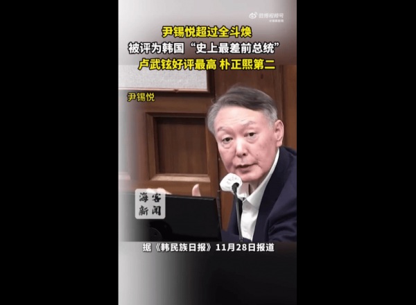 据海客新闻:《韩民族日报》11月28日报道,民调机构"盖洛普韩国"近日开展的一份民意调查显示,尹锡悦被评为"韩国史上最差前总统"。而在上一次的调查中,被评为"韩国史上最差前总统"的是全斗焕。