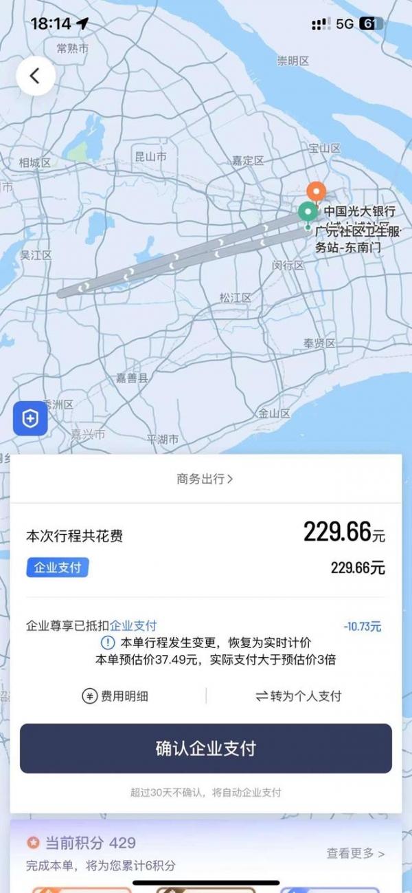 然而,当行程结束时,张先生惊讶地发现滴滴平台显示的车费高达229.66元,相当于预估价格的8倍之多。
