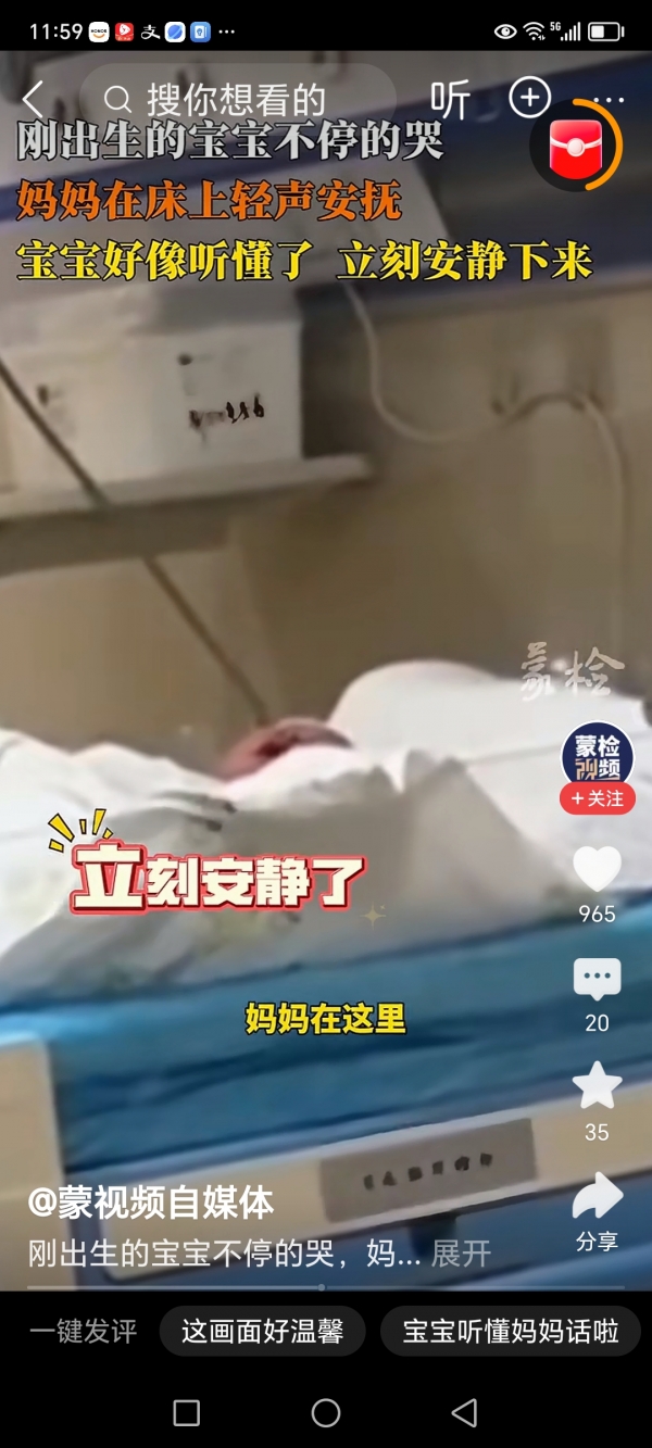 有育儿专家解释,新生儿的视力还没发育好,看不清眼前的人和物,但嗅觉却相当灵敏。妈妈身上的气味,能刺激宝宝大脑分泌安抚情绪的物质,让他们从紧张、哭闹的状态迅速平静下来。