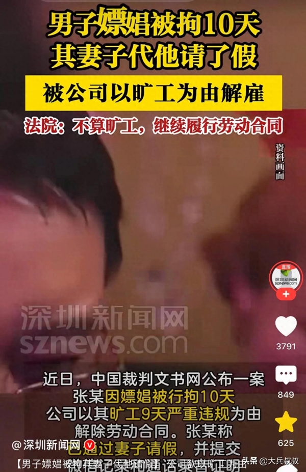 近日,中国裁判文书网公布一案。张某因嫖娼被行拘10天,公司以其旷工9天严重违规为由解除劳动合同。张某称已通过妻子请假,并提交微信记录和通话录音证明。