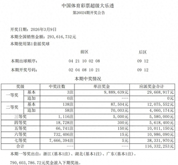 体彩大乐透第26024期开奖结果出炉,本期头奖表现亮眼,单注奖金达到988万元,创下近期新高,全国仅开出3注,分别由浙江、湖北、广东三地彩民斩获,稀缺性十足。与此同时,二等奖成色相对一般,奖池则稳步攀升至7.9亿元,距离8亿大关仅一步之遥,一旦触发阈值,固定奖将迎来上调,备受彩民关注。