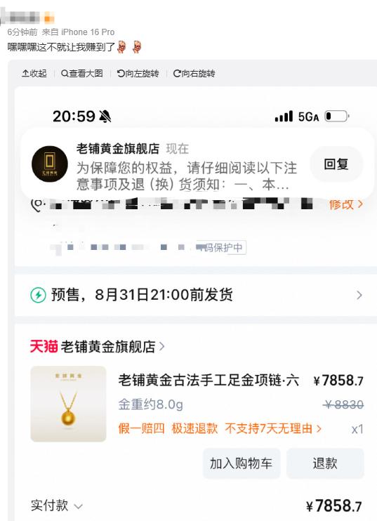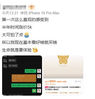 很多人庆幸在涨价前夕"上车",也有的赶上了"最后一班车"。网友"叶小花大人"表示,还在犹豫买不买的时候,发现自己心仪的一条金项链涨价1500多,幸亏昨天已下单未付款,赶紧下单买下。