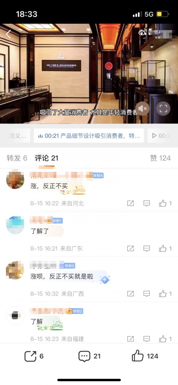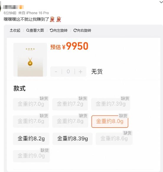 经常关注老铺黄金产品的消费者也在第一时间去对比涨价幅度。