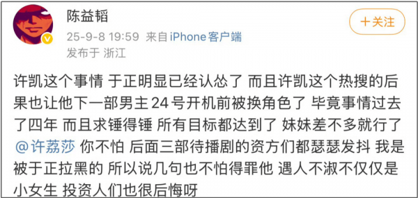早前,制片人陈益韬率先下场爆料相关,透露称许凯原定主演的新剧《听风令》已被换角,让许荔莎见好就收,不要再翻许凯旧账,而且于正也认怂了。