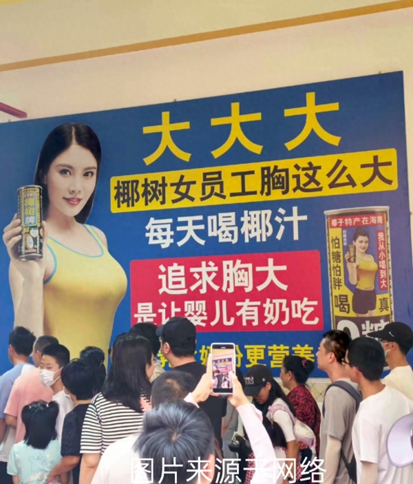 就在这几天,椰树又双叒召登上热搜了。原因?还是老配方--擦边。网友爆料,椰树集团内部挂着"大大大""女员工胸这么大"的广告语,客服轻飘飘一句"会改进",直接把舆论炸开了锅。
