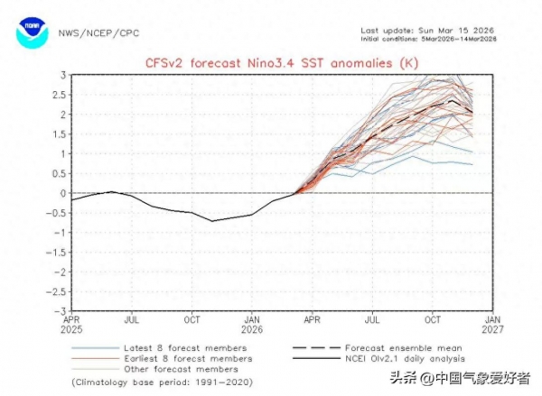 随着2026年第一季度的结束,全球气象界的目光再次聚焦于赤道太平洋的深处。根据美国国家气象局(NWS)下属气候预测中心(CPC)于3月15日发布的最新CFSv2数值模式预报,代表厄尔尼诺核心状态的Nino3.4海温异常指数正呈现出令人心惊肉跳的上升曲线。在经历了短暂的中性状态后,预测线如同脱缰野马一般集体上扬,预示着一场强劲的气候变动正在酝酿。面对这种趋势,公众最关心的莫过于:即将到来的夏天是否会成为史上最热的一年?
