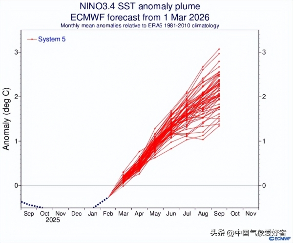 从最新的海温距平预报图来看,自2026年4月起,赤道中东太平洋的海温将进入急剧增暖通道。预测结果显示,大多数预报成员均认为Nino3.4指数将在夏季迅速突破1.0℃的临界点,并于秋季冲向2.5℃甚至更高。这种增温幅度在气象定义中已达到了强厄尔尼诺乃至超强厄尔尼诺的标准。