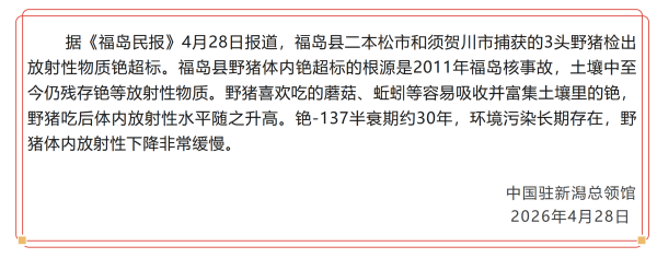 微信公众号"中国驻新潟总领馆"消息,据《福岛民报》4月28日报道,福岛县二本松市和须贺川市捕获的3头野猪检出放射性物质铯超标。福岛县野猪体内铯超标的根源是2011年福岛核事故,土壤中至今仍残存铯等放射性物质。野猪喜欢吃的蘑菇、蚯蚓等容易吸收并富集土壤里的铯,野猪吃后体内放射性水平随之升高。铯-137半衰期约30年,环境污染长期存在,野猪体内放射性下降非常缓慢。