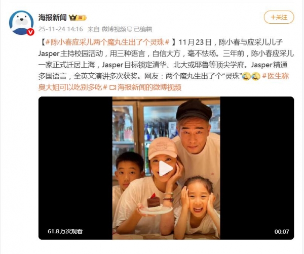 11月23日,陈小春与应采儿12岁的大儿子Jasper(陈胤捷)在上海某校园活动中火了--面对台下上千观众,他全程用中、英、粤三语流利主持,台风沉稳自信,毫不怯场。消息一出,迅速引爆全网。性格火爆如"山鸡哥"的陈小春,加上快人快语的应采儿,被网友调侃为"两个魔丸",而温润谦和、才华在线的Jasper,则被赞是"灵珠转世",活脱脱现实版《哪吒》剧情。