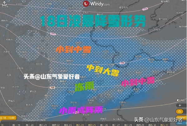 17日夜间到18日白天,全省天气多云转阴,济南北部、淄博、潍坊、青岛北部和鲁西北地区有中到大雪,烟台和威海有小雪,泰安、济南南部、日照和青岛南部有小雨或雨夹雪转小到中雪,其他地区有小雨或雨夹雪;鲁中山区局部有冻雨。潍坊、菏泽、鲁西北和半岛地区北风4级阵风5~6级,其他地区偏东风转北风3~4级。最低气温:鲁南地区1℃左右,半岛内陆地区-5℃左右,其他地区-2℃左右。