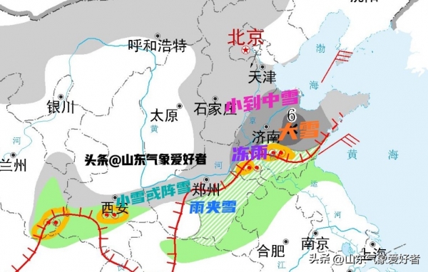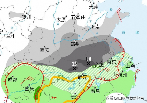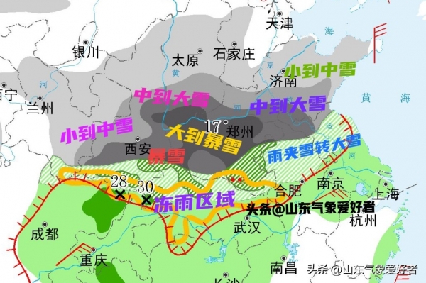 上图中可见,中央气象台分别预测湖北中北部和河南的东南部地区有12毫米和14毫米的暴雪,折合成积雪深度可达到10厘米以上。此外,黄淮南部、江淮、江南的部分地区将先后经历雨夹雪或雨转雪的天气过程,部分地区可能出现大范围冻雨。
