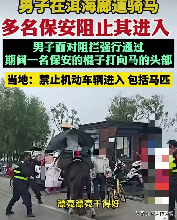 近日,多名网友在社交平台发视频称,在云南大理洱海生态廊道附近,一位骑马旅行的网红想要骑马进入廊道,被保安制止了,网红不听劝阻准备骑马强行进入,此时一名保安就用棍子打了马头,双方发生争执,当地相关部门对此回应是,洱海生态廊道是禁止机动车辆进入,也包括马匹。