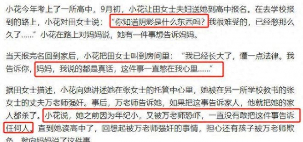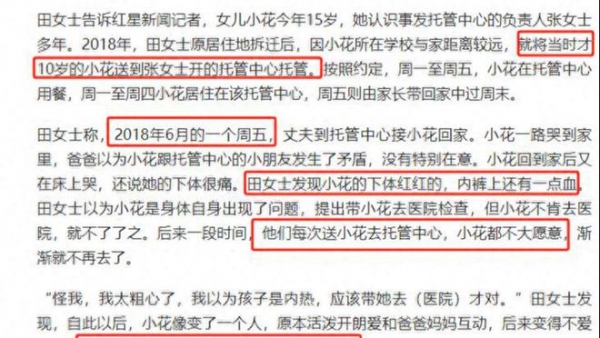 田女士描述小花告诉她,在张女士的托管中心,小花被万老师强奸,并受到威胁。小花因年纪小和恐吓而一直未告诉家人,直到高中时才向田女士透露此事。小花担心还有孩子受害,所以告诉了妈妈。