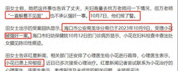 田女士夫妇向警方报案称小花被万老师强奸。警方已受理此案,调查正在进行中。海口市妇幼保健院的门诊病历显示小花处女膜有陈旧性痕迹。