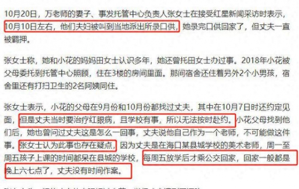 张女士表示,小花的父母曾两次联系她的丈夫,其中10月7日约定见面,但因丈夫需要治疗红眼病和学校事务而未能如期。她询问丈夫后,丈夫否认了指控。张女士认为此事存在疑点,因为丈夫在海口某县城学校任美术老师,周中在校区工作,周末乘公交车回家,因此没有作案时间。张女士觉得丈夫遭到了诬陷。